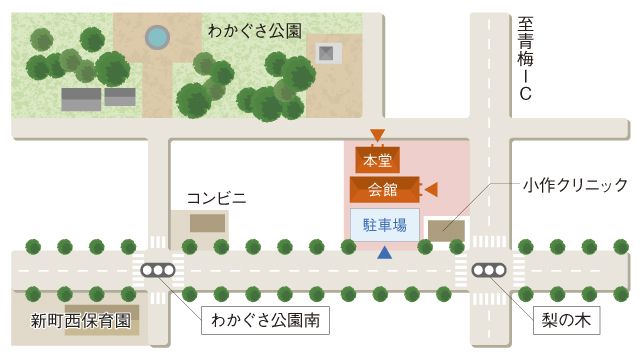 | 本堂は会館正面を通り公園側の道に出た左手にございます |