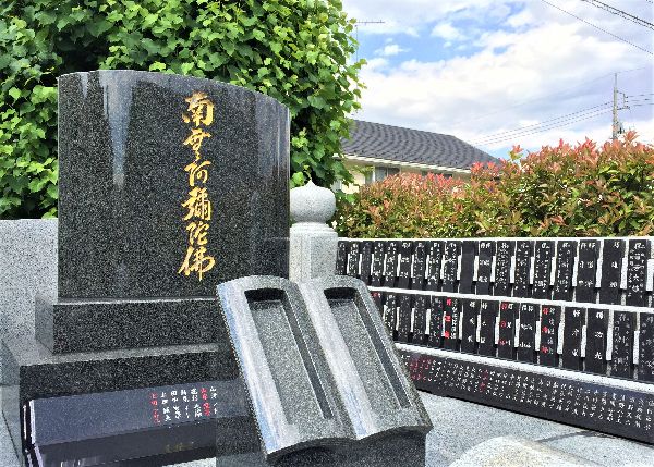 | 倶会一処碑(くえいっしょひ)は有縁廟中央の南無阿弥陀仏の石碑を中心に 並びます。 御納骨の方は納骨名板をご用意いたします。阿弥陀如来像の足元にある ものと同じ『蓮(はす)の花』を御法名・俗名の下にお彫りします。 倶会一処碑(共同墓誌を除く)・納骨名板は浄弘寺でご用意し、御納骨まで 本堂にてお預かりします。 |